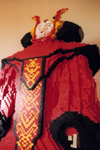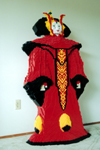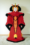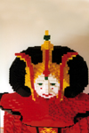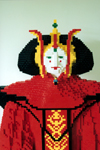 From Star Wars: Episode I: The Phantom Menace, this is my first LEGO sculpture. She's close to life size, heighting at about 5 ft. I haven't weighted her, but I know she's rather heavy--ask my foot, who she fell on during construction. And I haven't counted the number of pieces. Roughly, it took 46 tubs of 1200 pieces (she's not hollow, she's got a structurally sound interior for supporting her weight), 1 Halloween bucket (for the orange that didn't photograph too well, on the "light balls" at the bottom of her royalness), and some tan pieces (hands). Timewise, I worked on her for about a month. |